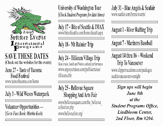 June 27:Taste of Tacoma Food Festival July 3:Wild Waves Waterpark July 17: Bite of Seattle and IMAX July 18:Mt Rainier Trip July 24: Tillicum Village Trip July 25:Bellevue Square Shopping and Arts Fair July 31:Blue Angels and Seafair August 1:River Rafting Trip August 7:Mariners Baseball August 14-16:Weekend Trip to Vancouver